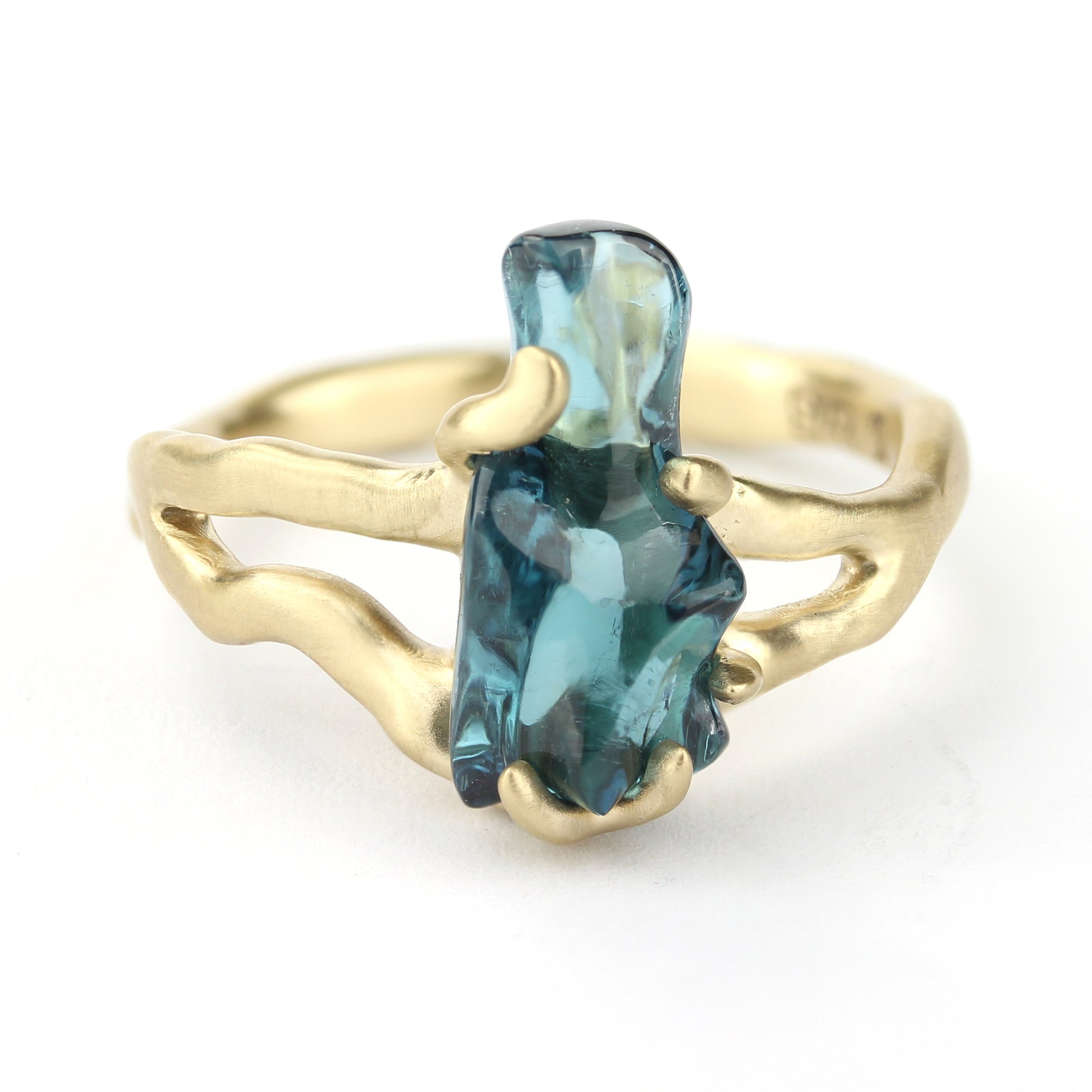 Featuring a blue 4.32ct hand carved Afghan Tourmaline this 9kt gold ring wraps around the stone, reminiscent of the way a bonsai's root system might grab the boulder it is perched on.