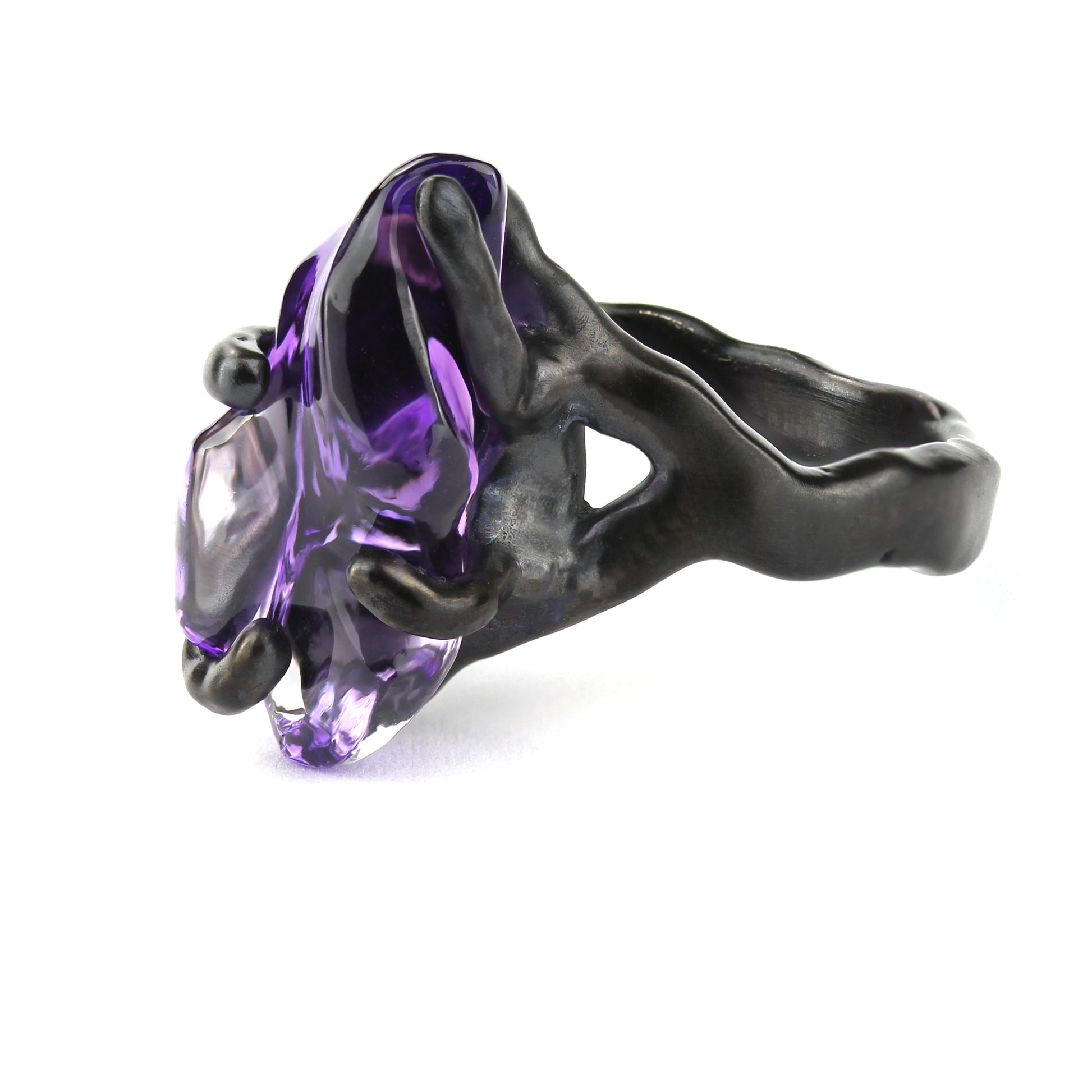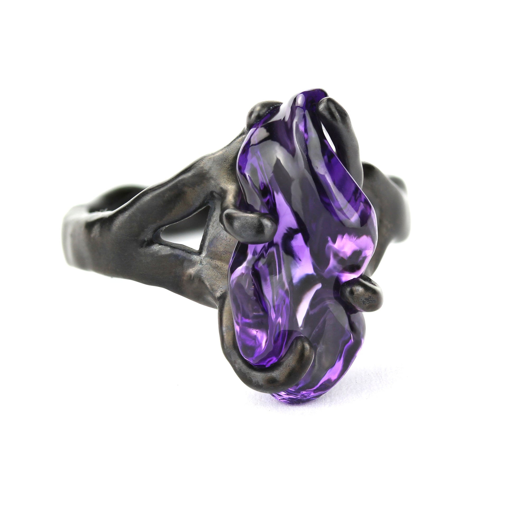 Featuring a rich purple 7.84ct hand carved Nigerian Amethyst this black ruthenium plated sterling silver ring wraps around the stone, reminiscent of the way a bonsai's root system might grab the boulder it is perched on.