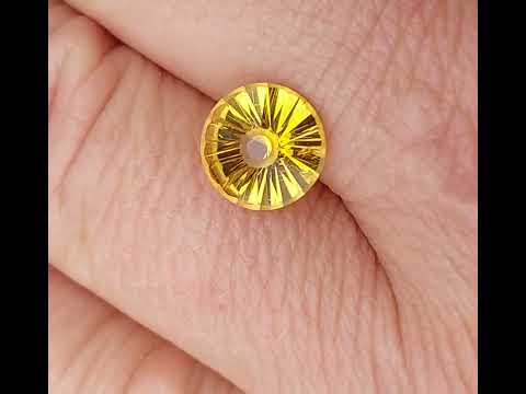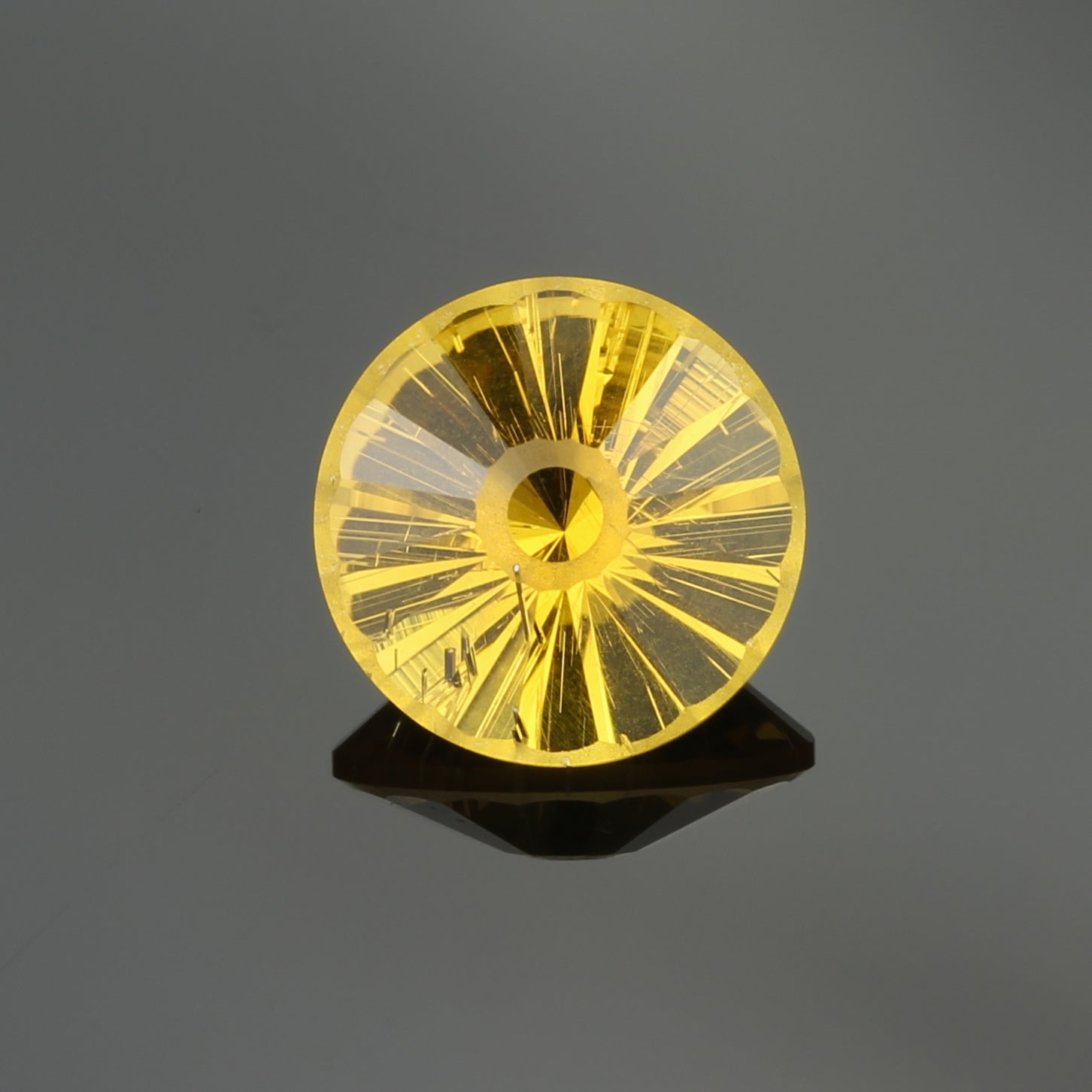 This funky almost 1.5ct yellow beryl (heliodor) is cut in a cool reflector pattern that dances between extinction and full colour. This material has some hollow tube like inclusions.