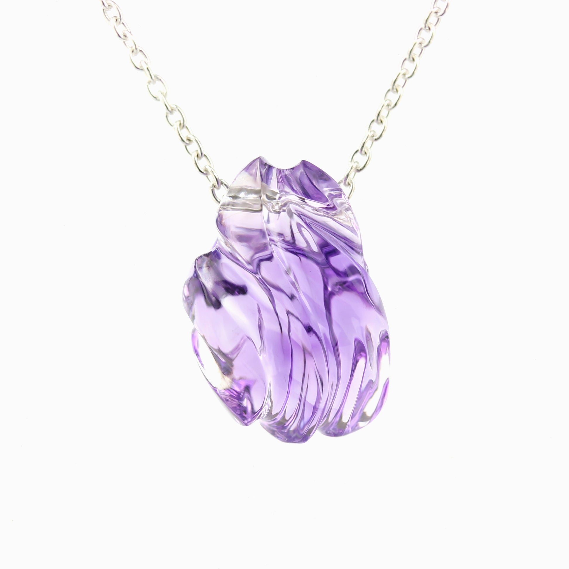 This flowy light purple amethyst is one of my personal favourites as it is so bright, clean and summery. Weighing in at 9ct it comes mounted on a sterling silver chain and is supplied with a branded wooden box.