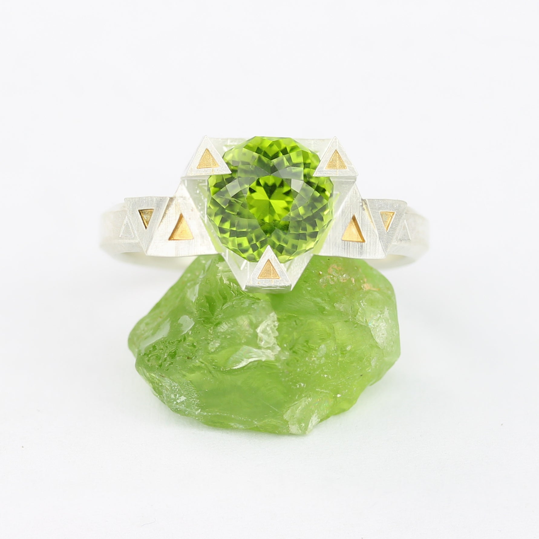 The "Prairie Crown" ring features a 3.11ct grass green Peridot from Pakistan cut in a Portuguese style cut. This stunning gem is mounted between three triangular turrets formed from sterling silver and with highlights in Gold. The triangular geometry in this unique design is continued throughout the ring for a very unique effect.