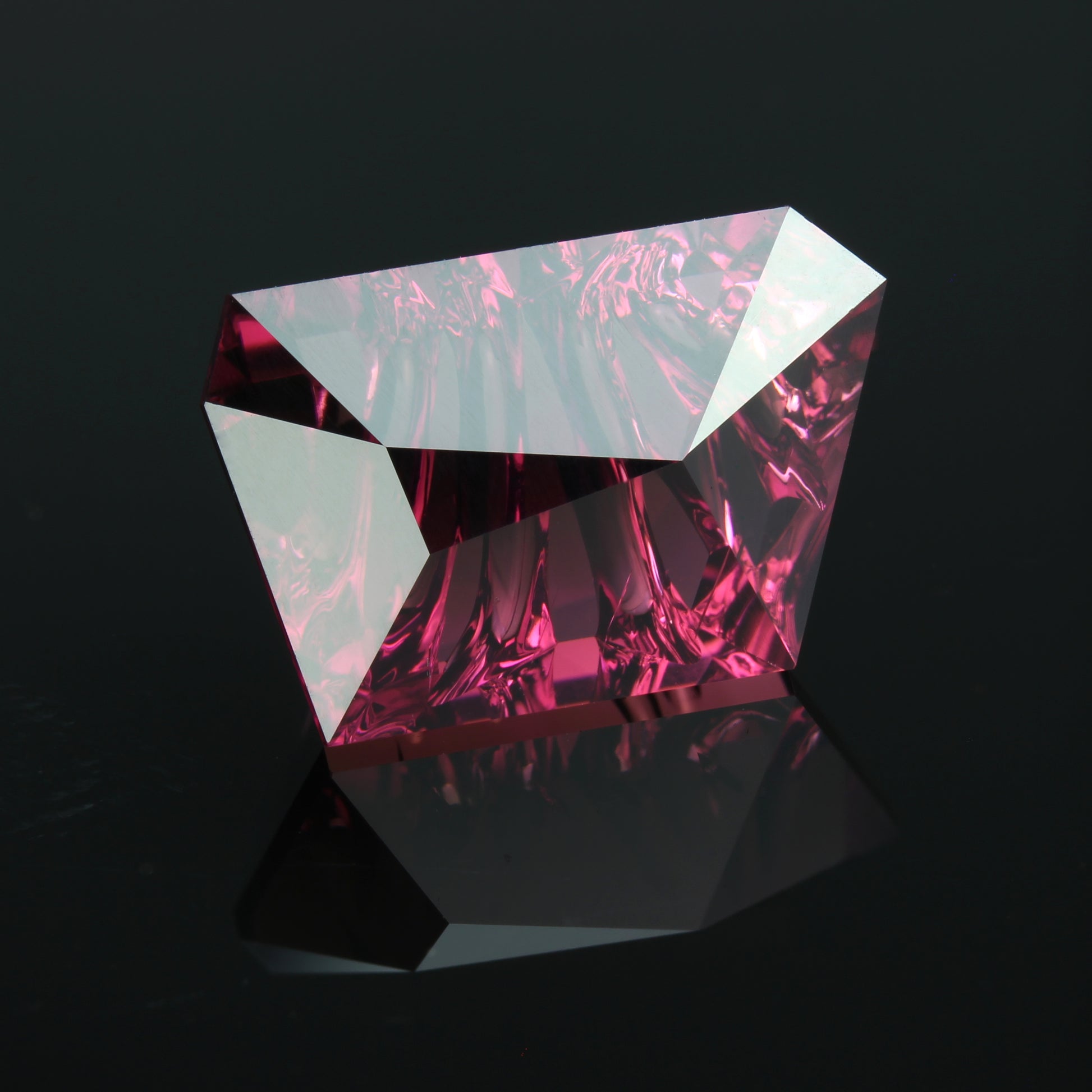 "Flaming Claret" this combination fantasy cut Rubellite features a hand carved pavilion contrasted with an angular free form shape and a crown featuring an arc of triangular facets. The colour has been described as flaming claret on my instagram channel and I have adopted it for the piece.