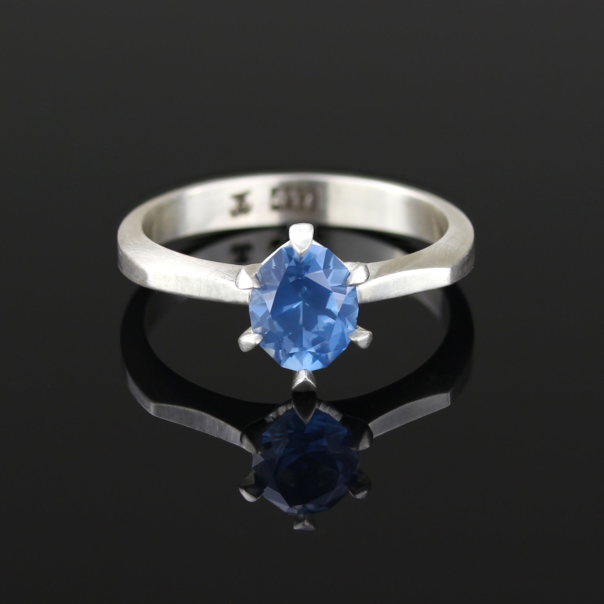 This ring holds a bright, heated cornflower blue Tasmanian Sapphire weighing 1.2ct. This stone is emblematic of Tasmania with bright blue colouring and full of sparkle it is the reason that Tasmanian Sapphires are held in such reverence amongst Australian gem sources. It is mounted in a matte finished 10kt white gold ring in my "shoulders" design.