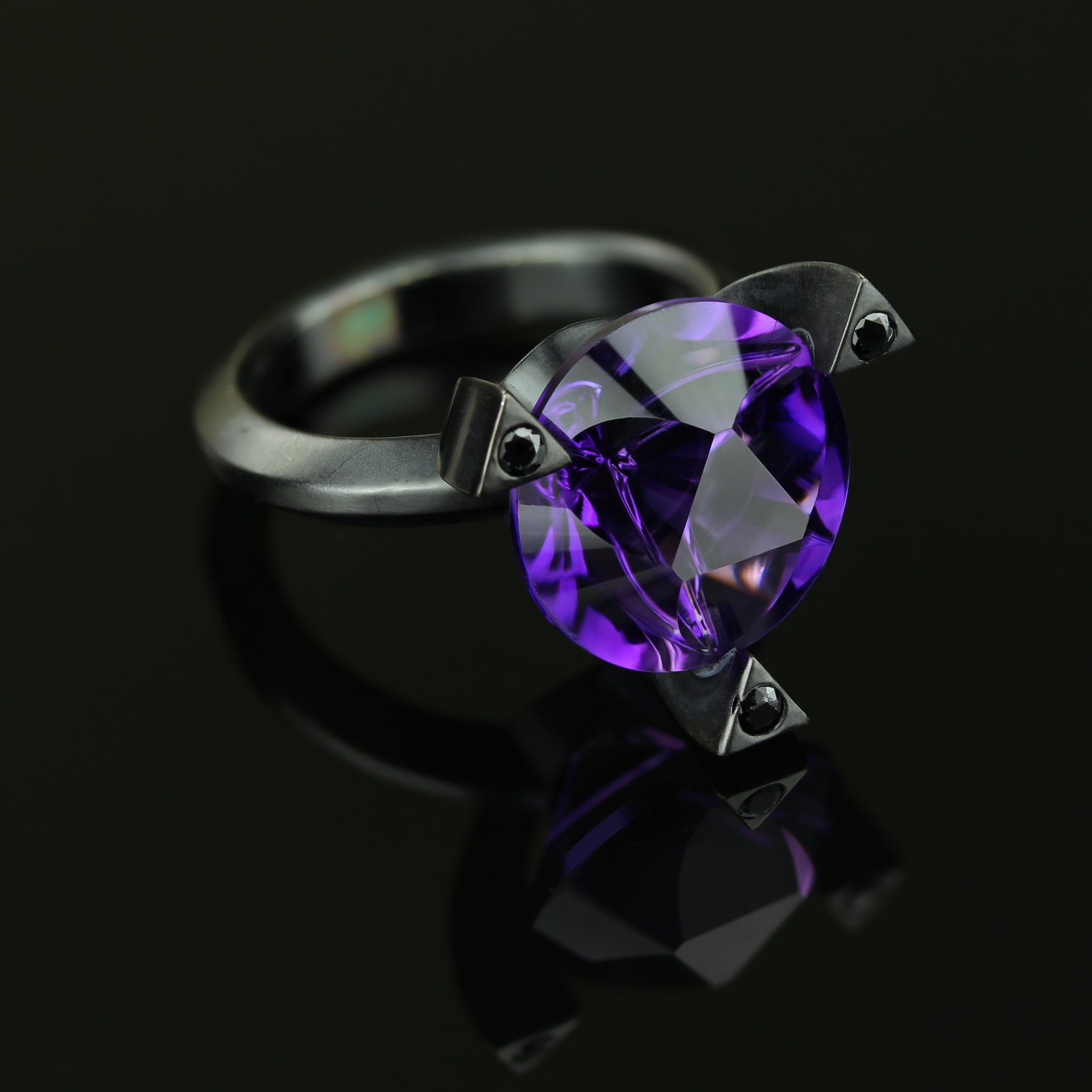 The centre stone in this black ruthenium plated sterling silver ring is an eye catching 10ct amethyst cut in my signature three body problem design. The three way symmetry of the gem is aligned with three triangular prongs top with Tasmanian spinels. If you are looking for a cocktail ring is totally unique and will be the talk of the town this is the one.