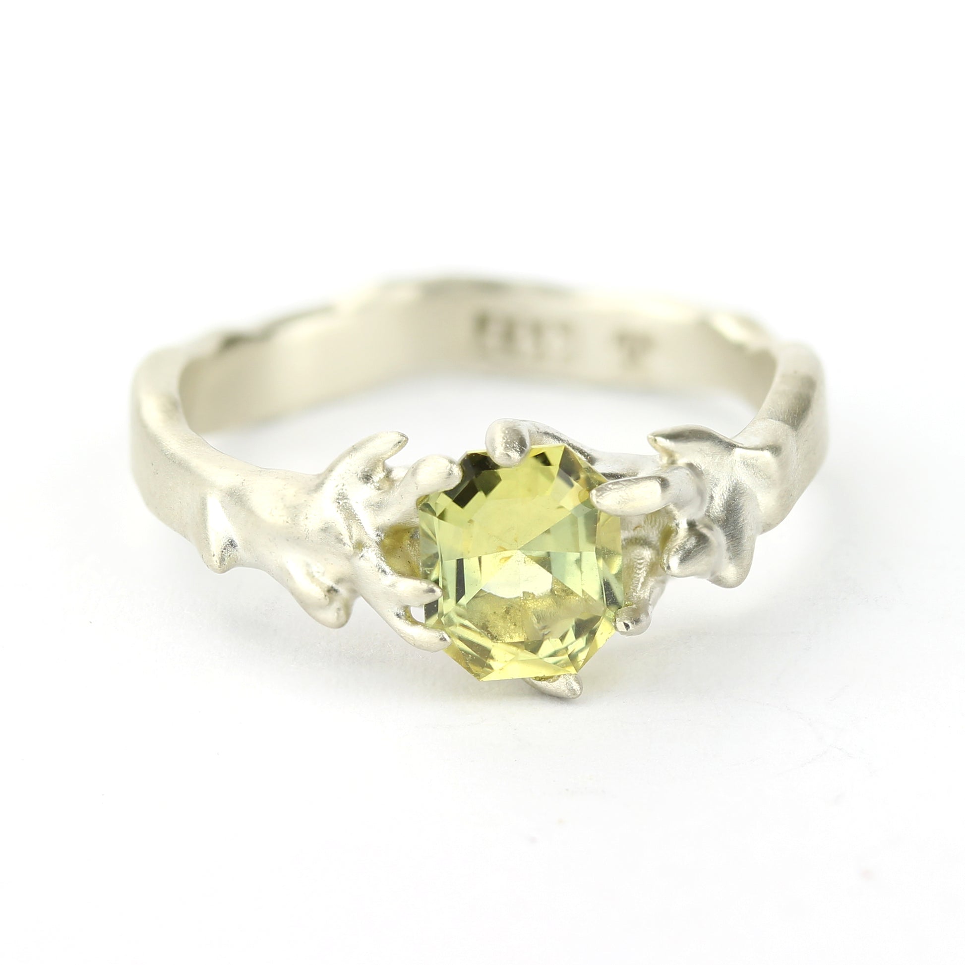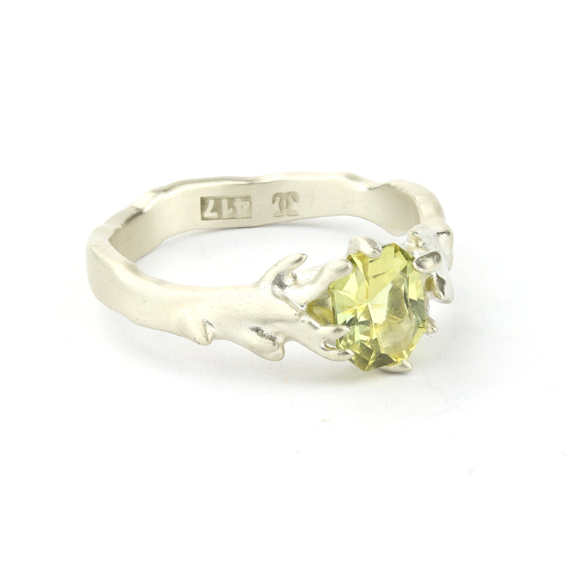 This bright yellow 1.3ct Australian sapphire was hand dug by Des in Queensland and faceted in his Tasmanian Studio. The unique 10kt white gold setting grabs the stone bringing to mind your favourite fantasy film or series.